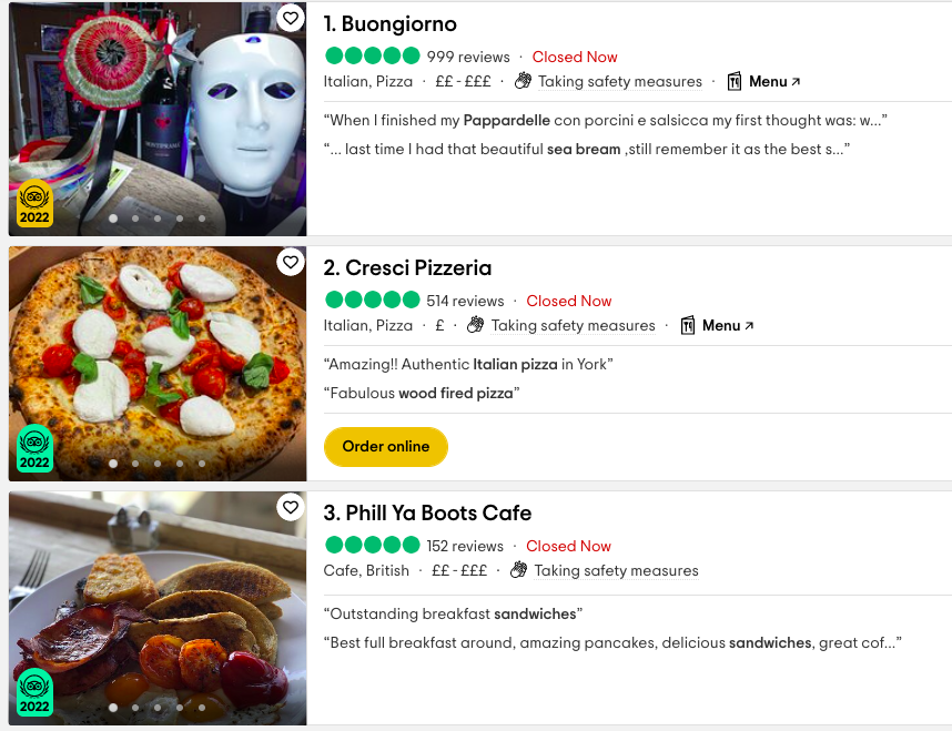 - Recency - This is TripAdvisors measure of consistency. A consistently good restaurant will produce a steady stream of happy customers so getting 50 great reviews one month and only 5 in the next will cause your ranking to drop. Similarly, if your most recent reviews are all bad, TripAdvisor will see this as a reflection of your current performance and these will influence your ranking much more than hundreds of 5 star reviews 6 months ago.