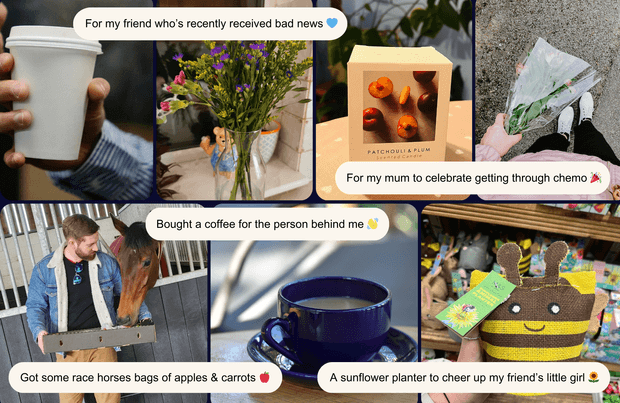 - Bought a coffee for someone behind in the cafe queue, offering a coffee voucher to a stranger, or sending one to a friend