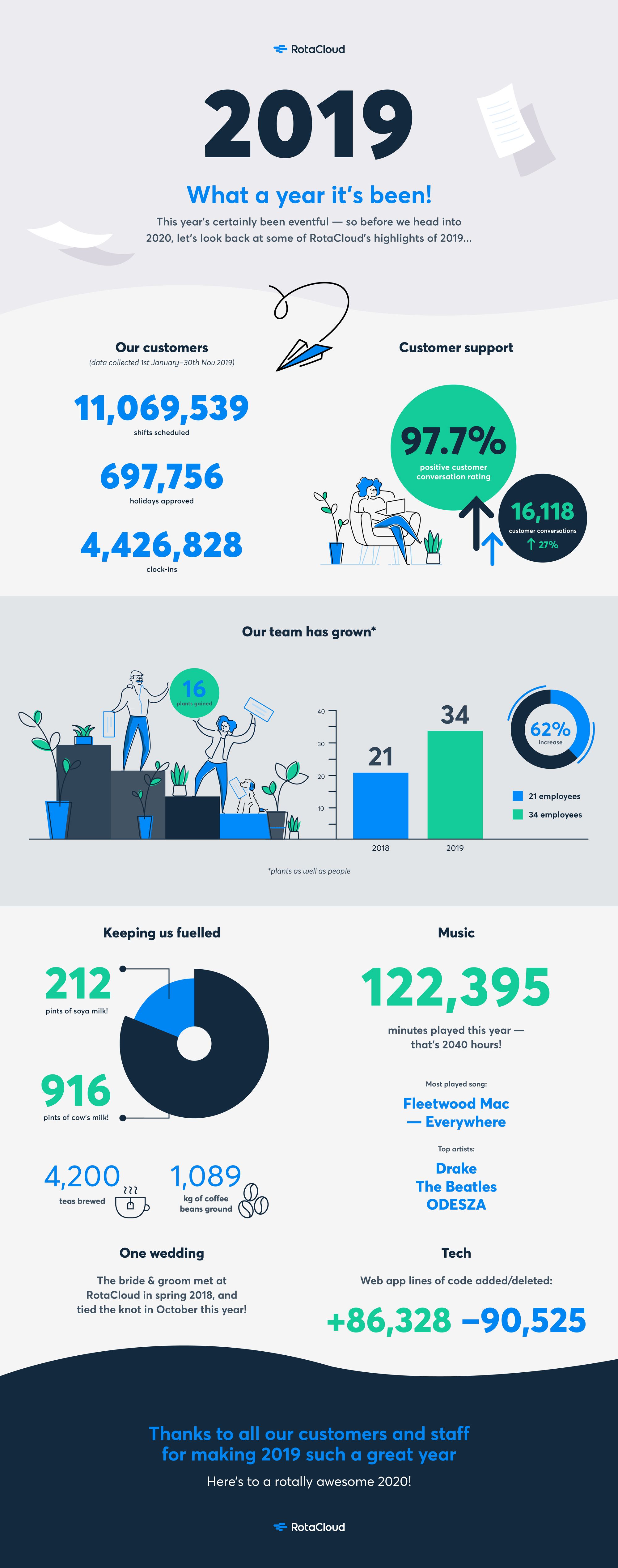 It's that time of year again! We're taking a quick look back at everything we've achieved this year at RotaCloud — from the chats we've had with our customers, to the cups of tea we've drunk and the music we've listened to!
