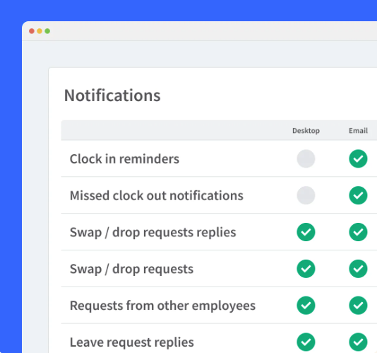 Holiday requests, shift swap & drop requests, and open shifts automatically notify the right people once accepted or available, keeping everyone in the loop (and you never understaffed).