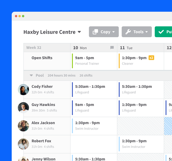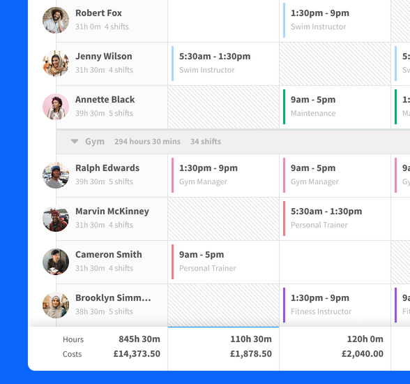 RotaCloud’s colour-coded Dashboard gives you a clear visual representation of where your staff will be, so you’ll know in an instant if you have your reception, track, pool, and even cleaning covered.
