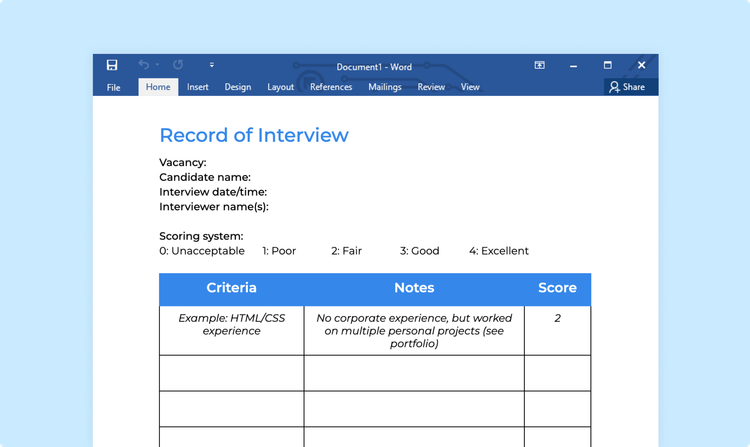 They’re also a useful way of comparing two or more candidates immediately afterwards since, provided each interview is recorded on its own sheet, their scores for the various criteria you decide can be easily looked at side by side.