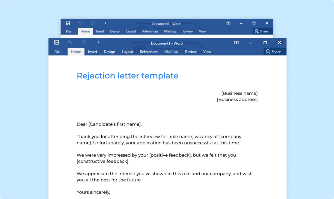 There’s no formal standard for what to include in a job applicant rejection letter, but there are a number of things that we recommend including — all of which you’ll find in our free rejection letter template above — both out of consideration for the applicant themselves, and to protect your business.
