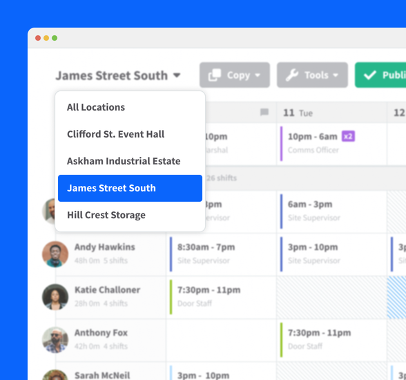 RotaCloud makes it easy to create, share, and manage rotas for security staff at every location you manage — as well as monitor your team’s clock ins, clock outs, and changeovers from anywhere.