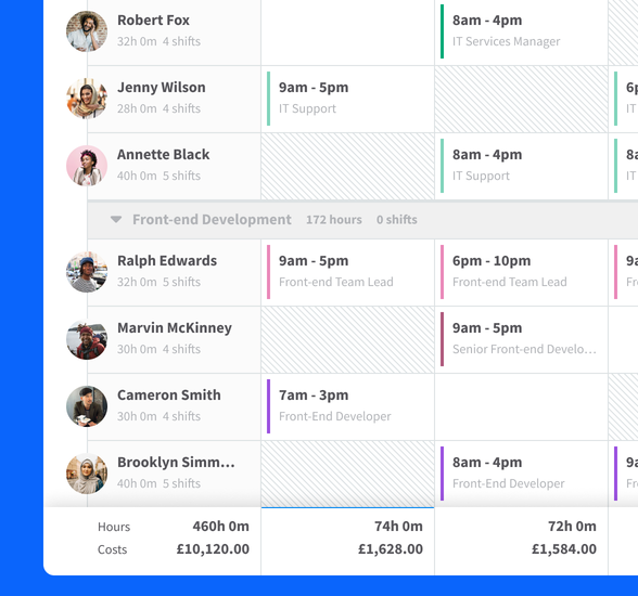 Whether you’re running a call centre or a customer support team, maintaining complete coverage is all-important. RotaCloud shows you coverage at a glance for each of your various job roles, throughout the day. You can also check coverage and costs across each month.
