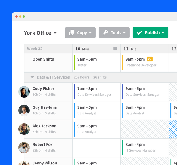 Let RotaCloud do the hard work for you. Gain complete control and visibility over every aspect of the staff rota, from copying complex shift patterns across weeks and months, to tracking time accurately — even across different time zones.
